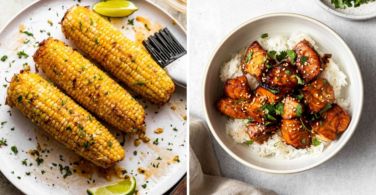 Sweet corn gets juicy and slightly charred in the air fryer. Brush ears with butter or oil, sprinkle with salt and pepper, and cook until kernels are tender and browned in spots.