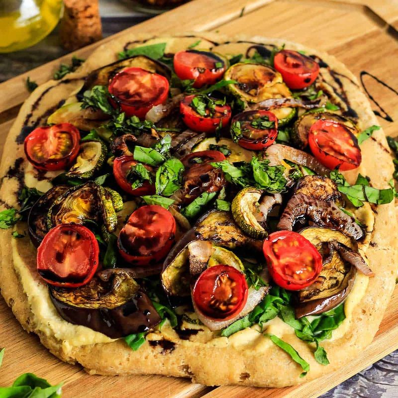 Hummus spreads like creamy gold, giving you protein and richness without melting cheese. Roasted zucchini, peppers, and red onion love that base, especially with cumin and paprika.