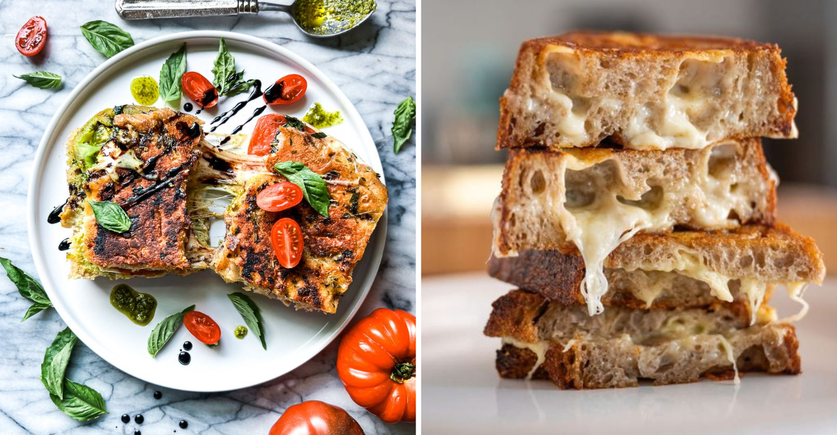 Turn caprese into a hot press by roasting cherry tomatoes until jammy. Layer tomatoes with fresh mozzarella and basil on crusty bread.