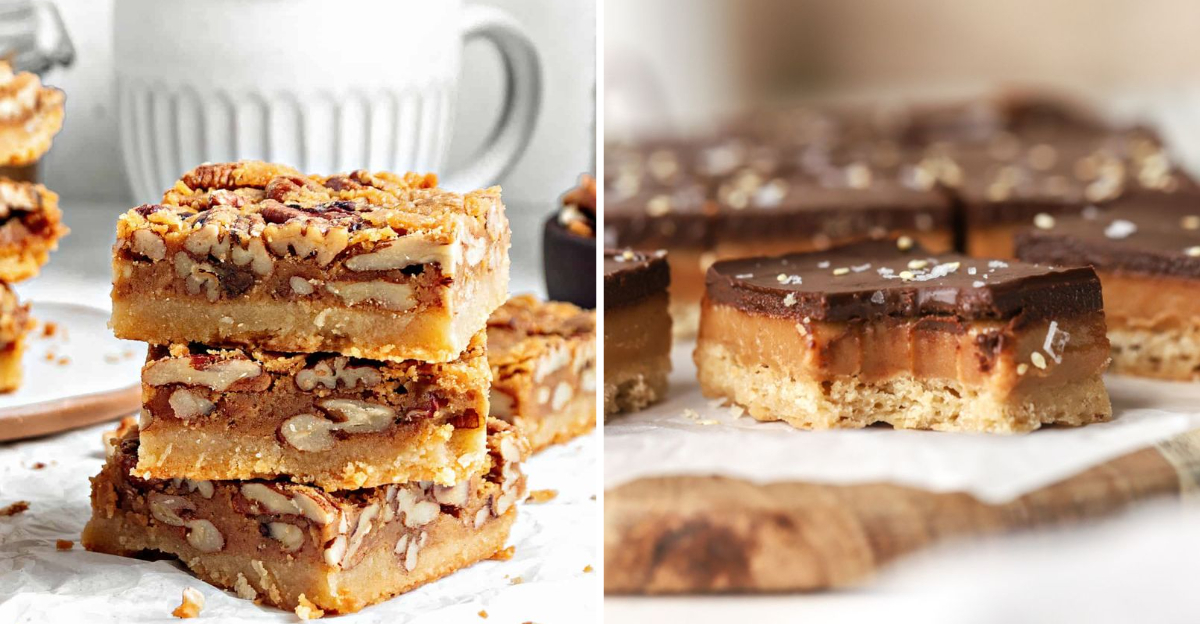 Buttery shortbread, maple kissed toffee, and toasted pecans create a fall favorite. You boil butter, sugar, and maple syrup to a crackly toffee, then pour over the crust.
