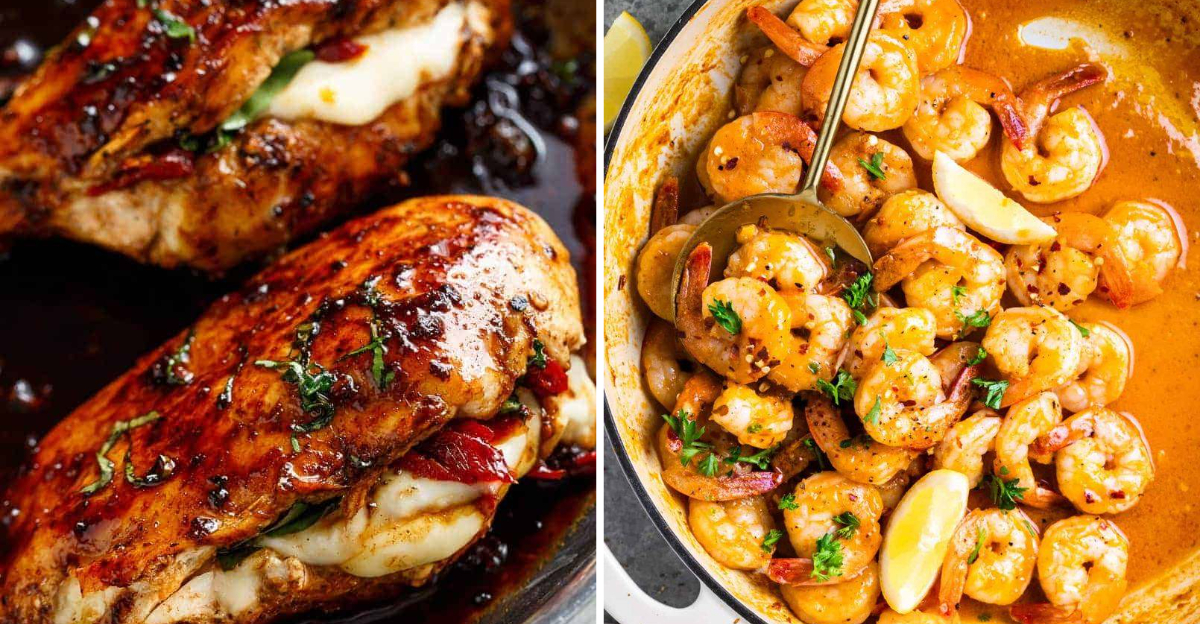 Butterfly chicken breasts and pack them with mozzarella, tomatoes, and basil. Sear until golden, then finish in the oven with a balsamic drizzle.