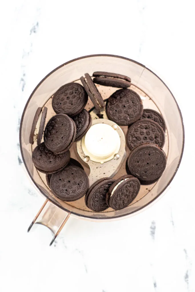 - Meanwhile, place Oreos in the food processor and finely chop. If you don’t have a food processor you can place them in a large zip top bag and crush with a rolling pin or mallet.