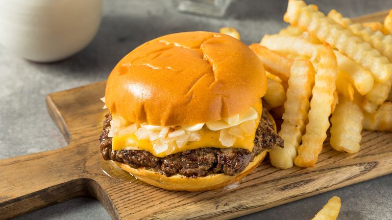 Oklahoma smashes thinly sliced onions into burger patties while they cook, creating a fried onion burger with caramelized, crispy edges.