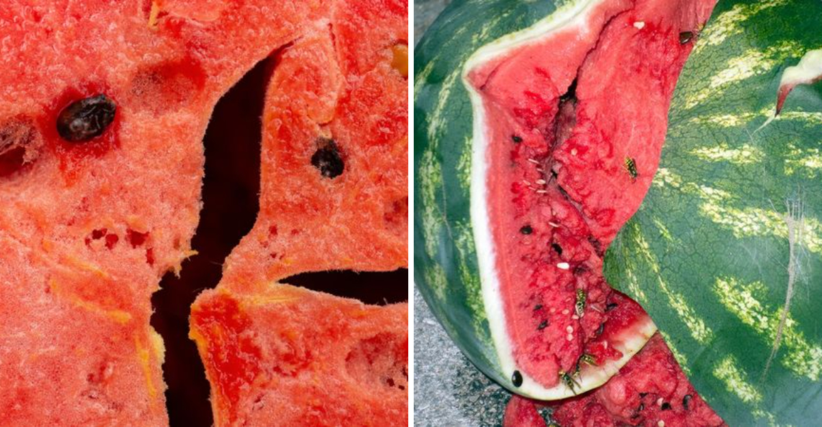 Any fuzzy growth on cut watermelon is a hard stop. White, green, or black specks indicate mold colonies.