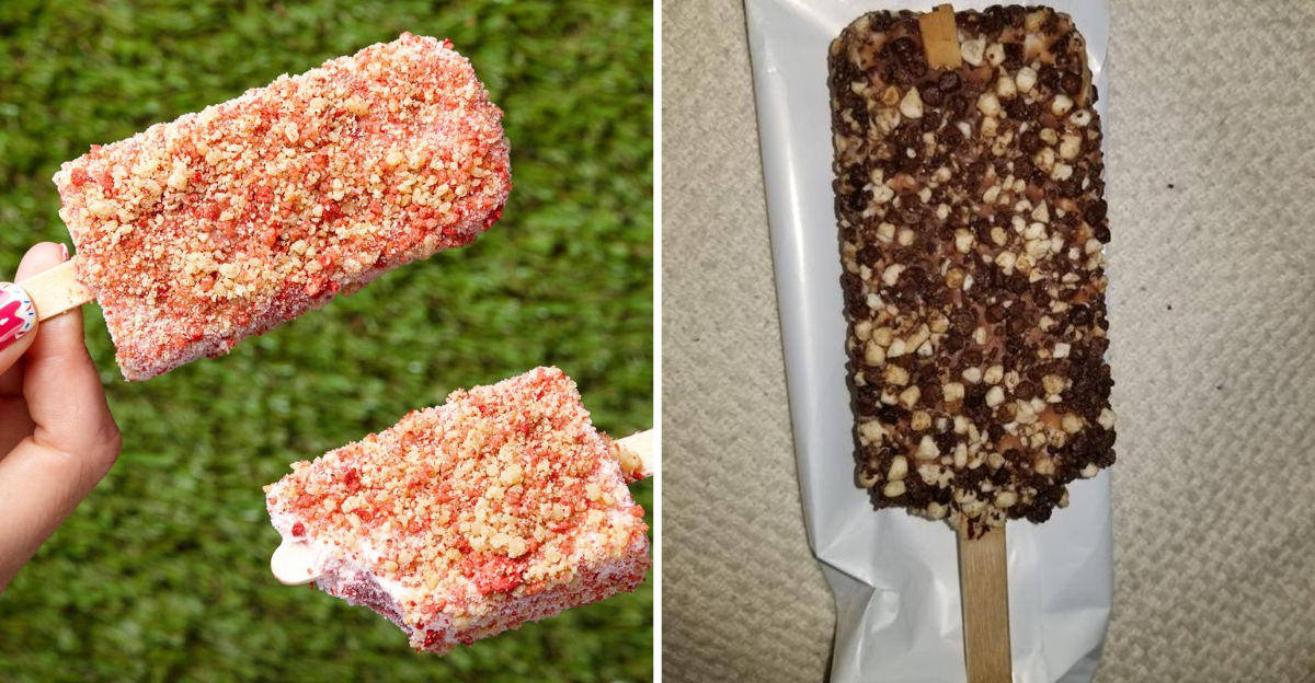 Born in San Francisco, this oatmeal cookie ice cream sandwich dipped in chocolate stayed regional royalty. It never disappeared, but national shipping created the illusion of a comeback.
